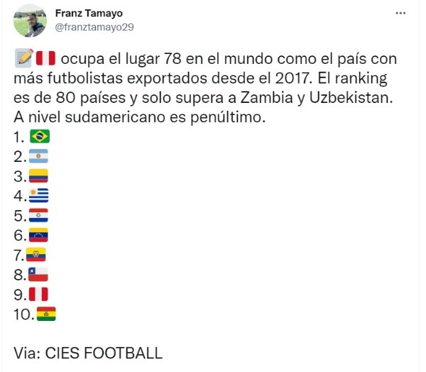 La lista consta de 80 países y de forma mundial solo nos ubicamos por encima de Zambia y Uzbekistan. Sudamericanamente estamos en el penúltimo puesto, estando por debajo de nosotros Bolivia. Si bien contamos con varios jugadores que están triunfando en el extranjero como es el caso de Christian Cueva, André Carrillo, Pedro Gallese y más, este número sería bajo para las expectativas mundiales.