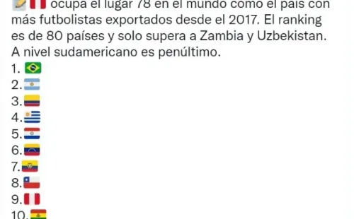 Lamentablemente, cuando parecía que distintas puertas de otras ligas se abrían no solo para los seleccionados nacionales; sino que también, para el fútbol peruano, esto no ha sido así. Según CIES Football, nuestro país se encuentra en el lugar 78 del ranking mundial como el país que más futbolistas exporta desde el 2017, números para nada buenos.