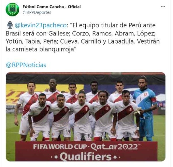 Los tituraes serán lo siguientes: Gallese; Corzo, Ramos, Abram, López; Yotún, Tapia, Peña; Cueva, Carrillo y Lapadula.