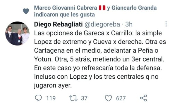 Diego Rebagliati, comunicador en Movistar Deportes, se animó a barajar algunas opciones que podría tener Ricardo Gareca ante laausencia de André Carrillo. Sin duda hará mucha falta en esta etapa del certamen y el delantero también lo sabe. “Las opciones de Gareca por Carrillo: la simple, López de extremo y Cueva por derecha. Otra es Cartagena en el medio, adelantar a Peña o Yotún. Otra, 5 atrás, metiendo un 3er central. En este caso yo refrescaría toda la defensa. Incluso con López y lo tres centrales que no jugaron ayer”, agregó ‘Reba’ en un post publicado en su Twitter.