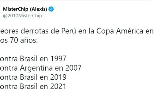 Sucede que el estadístico español Míster Chip reveló, tras la goleada de la Selección Peruana sufrida a manos de Brasil, que el resultado se establece como uno de los peores cuatro logrados por la ‘Blanquirroja’ en la Copa América a lo largo de los últimos 70 años. Iniciando los nefastos marcadores en el año de 1997, el numerólogo mencionó que el 4-0 igualó al obtenido en la Copa América 2007, tanteador que se dio antela Selección de Argentina.