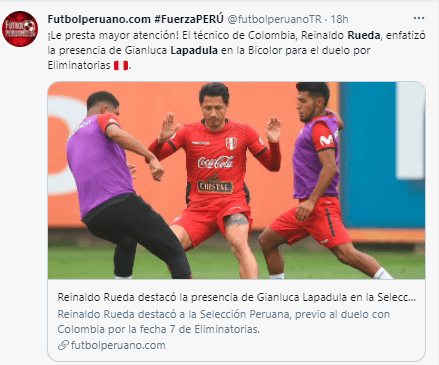 “No solo es la presencia de Paolo Guerrero, sino del nuevo jugador que han vinculado desde Italia (Lapadula). De modo que es un grupo maduro, compacto y una selección muy competitiva. Tenemos que encarar este partido con seriedad y concentración para sacarlo a favor nuestro”. Precisó en la transmisión oficial para la Federación Colombiana de Fútbol.