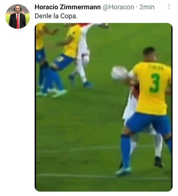 El brazo de Thiago Silvava en dirección de la pelota para impedir que se dirija al arco brasileño, lo cual sería claramentepenal. El juez chileno Roberto Tobar no se inmutó y ni consultó con el VAR, a lo que el periodista Horacio Zimmermann colgó una publicación en Twitter poniendo “Denle la copa” y la imagen exacta del momento en el que el back central hace el movimiento con su extremidad.