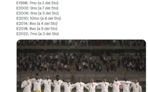 En la cuenta de Twitter de ‘Datos No Opiniones’ hicieron una lista de las veces que la ‘bicolor’ ha estado cerca del tan ansiado quinto puesto en la tabla de posiciones en las Eliminatorias para clasificar a un Mundial: “E1998: 7mo (a 3 del 5to) E2002: 9no (a 7 del 5to) E2006: 9no (a 3 del 5to) E2010: 10mo (a 6 del 5to) E2014: 8vo (a 4 del 5to) E2018: 8vo (a 5 del 5to) E2022: 7mo (a 3 del 5to)”.