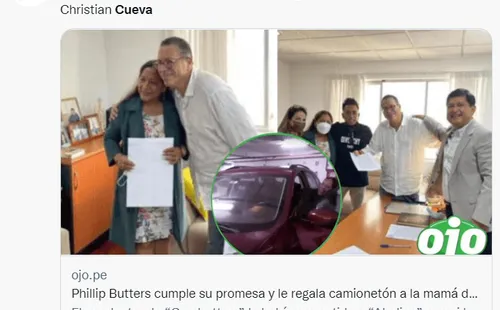 “Este mensaje es de agradecimiento a mi ahijado Christian Cueva … Christian Cueva, Phillip Butters cumple con su promesa, yo le voy a regalar a tu mamita su carro cero kilómetros por tener un hijo tan hermoso y dedicado como eres tú (Cueva)”, fueron las palabras de Phillip Butters al día siguiente del triunfo de la ‘Blanquirroja’ en Barranquilla, confirmando queregalaría el auto.