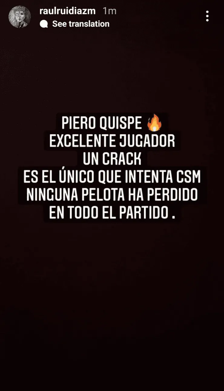 “Piero Quispe, excelente jugador. Un crack. Es el único que intenta, ninguna pelota ha perdido en todo el partido“, fueron las palabras del exjugador de Universitario en sus historias de Instagram.
