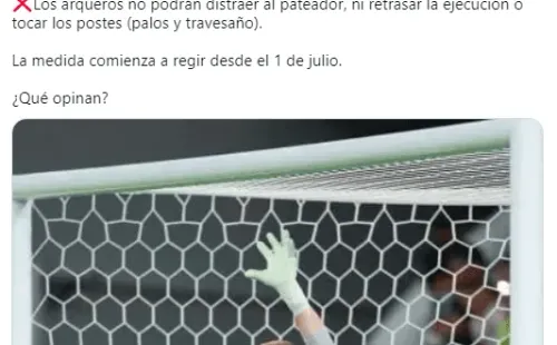 “La International Football Association Board (IFAB) aprobó un cambio para los penales. Los arqueros no podrán distraer al pateador, ni retrasar la ejecución o tocar los postes (palos y travesaños). La medida comienza a regir desde el 1 de julio. ¿Qué opinan?”, publicó.