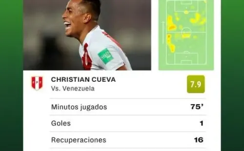 Los números de ‘Aladino’ en el partido frente a Venezuela le alcanzaron para que se encuentre en el once ideal de SofaScore, en esta jornada Eliminatoria, con un puntaje de 7.9 en total. El peruano logró ganar 10 de 16 duelos en el cotejo, 2 pases clave, 16 recuperaciones y un gol en 75 minutos de juego.