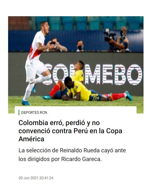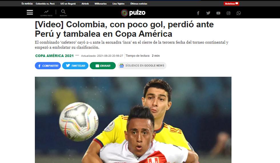 En ese sentido, los medios colombianos calificaron la derrota de su selección como un hecho inesperado y que fue producto de sus propios errores. Sin destacar la cantidad de pelotas que robó Renato Tapia o las atajadas que tuvo el portero Pedro Gallese, Gol Caracol, Pulzo, El Tiempo yDeportes RCN apuntaron al juego mostrado por los seleccionados cafeteros.