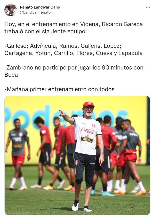 Todavía sin contar con todos los jugadores convocados a la Selección Peruana, el estratega argentino Ricardo Gareca ya empieza a trabajar con un once. Si bien fue durante un partido de práctica y sin contar con todos los elegidos, el sistema que empleó fue un claro 4-5-1. Poblando así el mediocampo, destaca la ausencia de un referente: Renato Tapia y la inclusión de una pieza vital de recambio: Wilder Cartagena.
