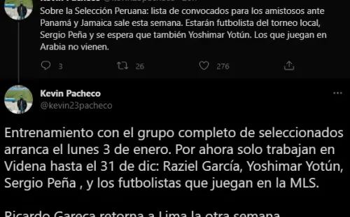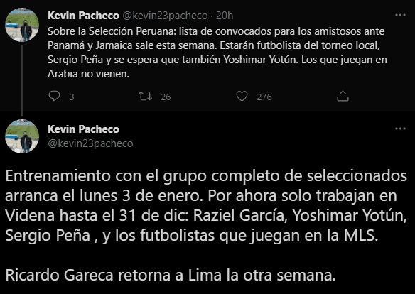“Sobre la Selección Peruana: lista de convocados para los amistosos ante Panamá y Jamaica sale esta semana (esta lista ya fue comunicada). Estarán futbolistas del torneo local, Sergio Peña y se espera que también Yoshimar Yotún. Los que juegan en Arabia no vienen”. Eso, en principio, apuntando que tanto el volante de Malmo, será considerado en estos amistosos.