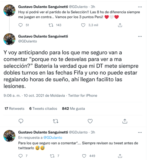 “Y voy anticipando para los que me seguro van a comentar “porque no te desvelas para ver a ma selección?” Bateria la verdad que mi DT mete siempre dobles turnos en las fechas Fifa y uno no puede estar regalando horas de sueño, ahí llegan facilito las lesiones”, justificó luego admitiendo que no ve todos los juegos de la Sele.