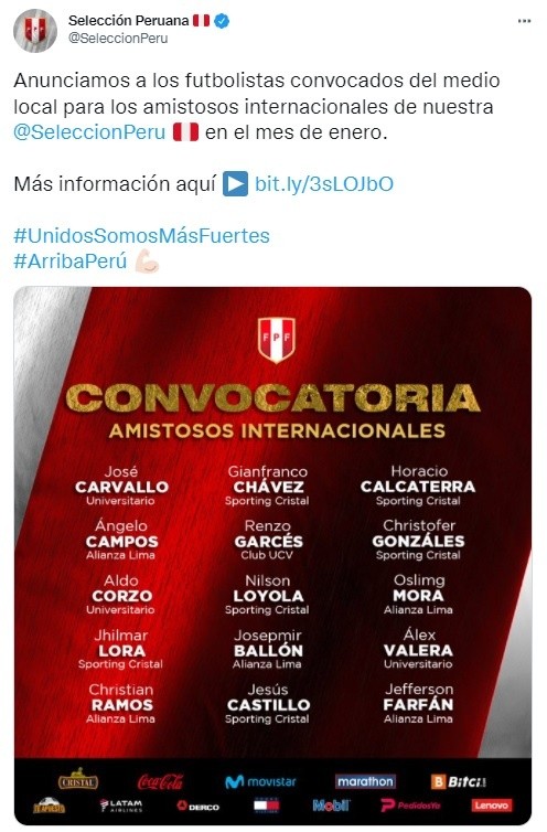 Ricardo Gareca presentó este jueves la lista de convocados del medio local para los encuentros amistosos que sostendrá la Selección Peruana ante Jamaica y Panamá en el mes de enero. Con estos partidos de preparación el ‘Tigre’ busca mantener el ritmo de la ‘Blanquirroja’ en las Eliminatorias Sudamericanas, para poder sumar en la próxima fecha doble y así poder clasificar al mundial de Qatar 2022.