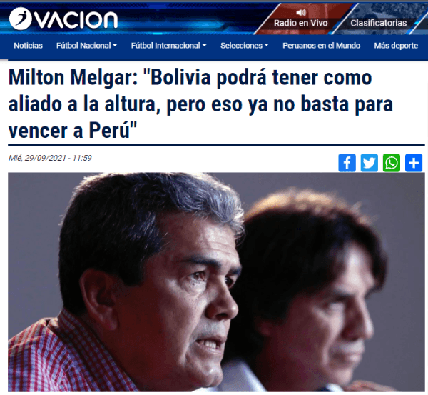 Sobre el cotejo que se vendrá entre Bolivia y nuestro país, afirmó lo siguiente: “Yo no diría que, en el partido ante Perú, la selección boliviana se juegue todas sus fichas porque fue una campaña bastante mala. Sucede que se han perdido muchos puntos de local y eso hace que no tengamos mucha chance de clasificar al Mundial, pero al margen de los puntos perdidos en casa tampoco hay mucha esperanza para que pueda mejorar el fútbol boliviano”.