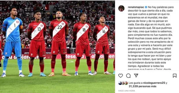 “Ser peruano no tiene precio, ser peruano es ser distinto, ser peruano es que a pesar de todas las circunstancias siempre estamos juntos, unidos. Juro que volveremos, sé que volveremos…”, finalizó Renato Tapia en su sentido mensaje en sus redes sociales.