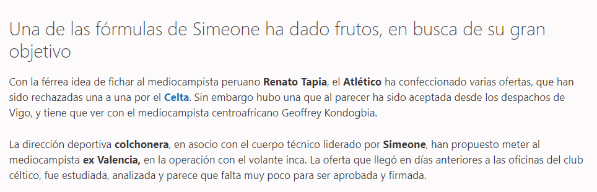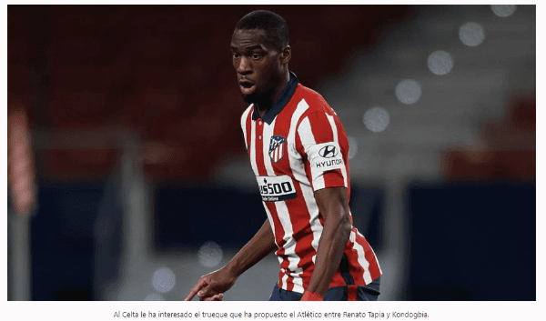 “Una de las fórmulas de Simeone ha dado frutos, en busca de su gran objetivo. Con la férrea idea de fichar al mediocampista peruano Renato Tapia, el Atlético ha confeccionado varias ofertas, que han sido rechazadas una a una por el Celta. Sin embargo hubo una que al parecer ha sido aceptada desde los despachos de Vigo, y tiene que ver con el mediocampista centroafricano Geoffrey Kondogbia”.