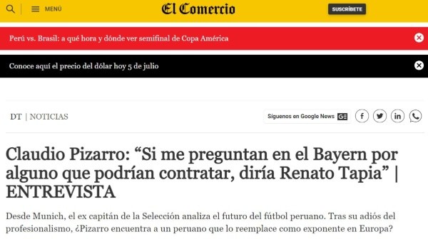 Ahora, recordemos que Claudio Pizarro en alguna entrevista con el diario El Comercio mencionó que él recomendaría a Renato Tapia al Bayern Múnich. Para ser más preciso, en la nota web publicada el 21 de marzo de este año, el ‘Bombardero de los Andes” fue claro y preciso con sus palabras.