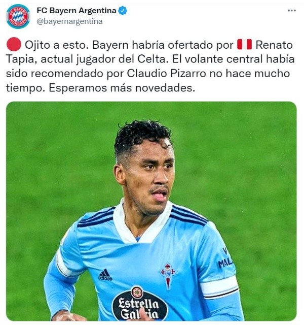 “Bayern habría ofertado por Renato Tapia, actual jugador del Celta. El volante central había sido recomendado por Claudio Pizarro no hace mucho tiempo. Esperamos más novedades”, comenta la cuenta de club de fans del FC Bayern Argentina.