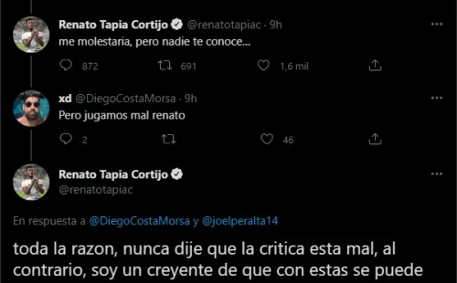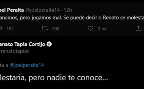 “Ganamos, pero jugamos mal. Se puede decir o Renato se molestará”. Precisó Peralta. E instantes después Tapia le contestó con todo: “Me molestaría, pero nadie te conoce…”. Siendo esto un momento de alto confrontamiento entre sus seguidores de “la red social del pajarito”.