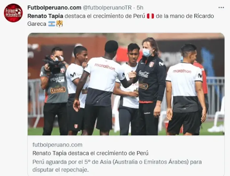 Renato Tapia, volante de la Selección Peruana, brindó declaraciones este sábado, donde resaltó el trabajo deRicardo Gareca, en su segundo proceso de clasificación a un mundial de la FIFA. Cabe resaltar que la’Blanquirroja’se enfrentará al ganador del partido entre Australia y Emiratos Árabes Unidos (los representantes de Asia) para conocer a uno de los 32 clasificados al Mundial Qatar 2022.