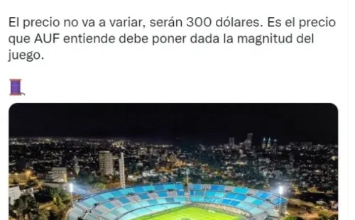 “Tenemos la seguridad de que las entradas se van a agotar. Tenemos una demanda de 4000 boletos. Hay 500 que se las lleva la FPF y quedarán 1500 a disposición de los hinchas, nos quedamos cortos en el precio que pusimos”, declaró Ignacio Alonso, presidente de la AUF, en el programa Último arco, dejando en claro que el monto estaría bien.