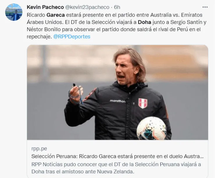 El encuentro entre Australia y Emiratos Árabes UnidoF, que definirá al representante de Asia que enfrentará a la Selección Peruana en el repechaje rumbo a Qatar 2022, tendrá la presencia de Ricardo Gareca. Según información de RPP Noticias, el ‘Tigre’estará presente el 7 de junio en el estadio Ahmad bin Ali de Rayán en Doha, para analizar a sus dos posibles rivales en la repesca intercontinental.