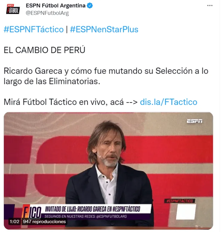 LaSelección Peruanaconsiguió su boleto para disputar el repechaje mundialista para Qatar 2022, tras quedar en el quinto lugar de las Eliminatorias Sudamericanas. En ese sentido, Ricardo Gareca fue entrevistado en Argentina por el periodistaMiguel Simón y el exjugador y comentarista Diego Latorre, quienesanalizaron sobre diversos aspectos de juego de la ‘Blanquirroja’.