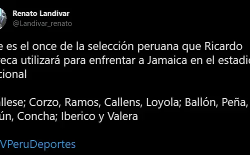 Ricardo Gareca según la información del periodista de TVPERU DEPORTES, Renato Landívar, va de la siguiente manera: “Este es el once de la selección peruana que Ricardo Gareca utilizará para enfrentar a Jamaica en el estadio Nacional: Gallese; Corzo, Ramos, Callens, Loyola; Ballón, Peña, Yotún, Concha; Iberico y Valera”.