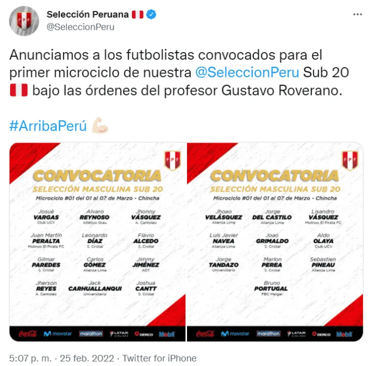De esta manera, los trabajosdelprimer microciclo sellevará a cabo del 1 al 7 de marzo en la Videnita de Chincha. Cabe resaltar que los clubes que más jugadores aportan en este llamado, son Sporting Cristal con seis y Alianza Lima con cinco futbolistas. El resto de jugadores pertenecen a equipos como; César Vallejo, Molinos el Pirata, FBC Melgar, ADT de Tarma, Cantolao y Atlético Grau.