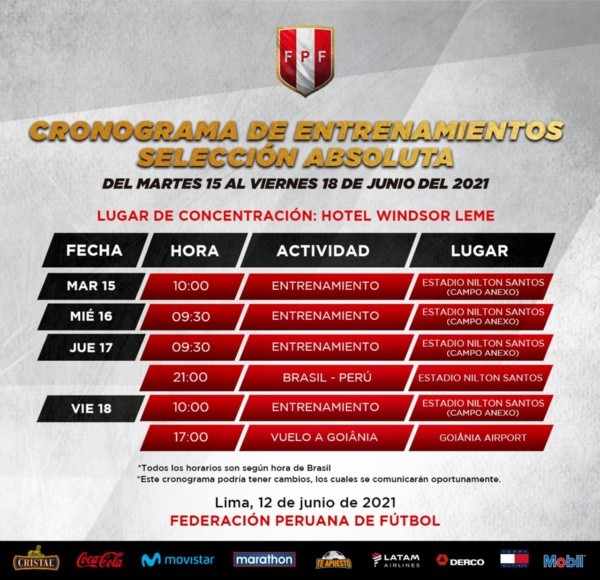 La Selección Peruana se hospedará en el Hotel Windsor Leme, en su llegada al país anfitrión del certamen. Este martes reanudarán los entrenamientos con vistas al partido del jueves. Este partido podría ser una revancha de la última final, en la Copa América 2019, también disputada en Brasil, donde ganaría el equipo local ganó por 3-1.