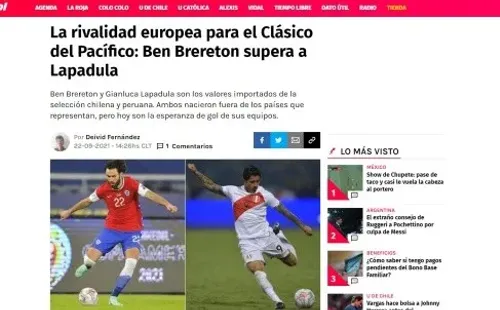 Finalmente, el medio chileno también comparó las anotaciones de su jugador en la selección con Gianluca Lapadula: “A nivel de selecciones, Lapadula tiene 13 partidos jugados y 4 anotaciones, por su parte, Ben, acumula 5 partidos y un gol”. Cabe resaltar que en Chile tendrán ausente a Arturo Vidal (suspensión por acumulación de tarjetas amarillas), mientras que en Perú hay una gran posibilidad que André Carrillo no sea convocado por una lesión en la espalda.