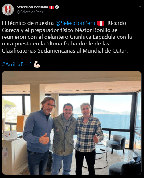 “El técnico de nuestra Selección Peruana, Ricardo Gareca y el preparador físico Néstor Bonillo se reunieron con el delantero Gianluca Lapadula con la mira puesta en la última fecha doble de las Clasificatorias Sudamericanas al Mundial de Qatar”. Fue lo que colocó en sus cuentas principales ‘La Blanquirroja’. Todos felices y contentos.