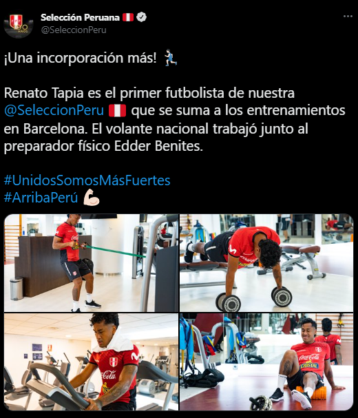 Mediante sus redes sociales, así fue presentado el volante de marca por el organismo regular del balompié local: “¡Una incorporación más! Renato Tapia es el primer futbolista de nuestra Selección Peruana que se suma a los entrenamientos en Barcelona. El volante nacional trabajó junto al preparador físico Edder Benites”.