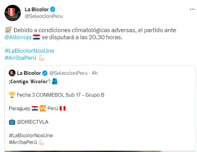 Es que por temas climatológicos el enfrentamiento entre la blanquirroja y los albirrojos se reprogramó para una hora y media más, es decir, a las 20:30 hrs. (hora peruana). Esto se pudo conocer por medio de las redes sociales de la Federación Peruana de Fútbol.