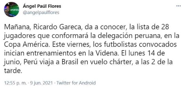 “Mañana, Ricardo Gareca, da a conocer, la lista de 28 jugadores que conformará la delegación peruana, en la Copa América. Este viernes, los futbolistas convocados inician entrenamientos en la Videna. El lunes 14 de junio, Perú viaja a Brasil en vuelo chárter, a las 2 de la tarde”, escribió este miércoles.