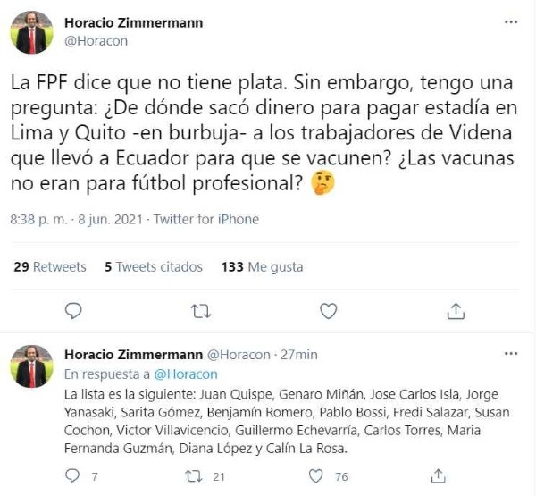 “La FPF dice que no tiene plata. Sin embargo, tengo una pregunta: ¿De dónde sacó dinero para pagar estadía en Lima y Quito -en burbuja- a los trabajadores de Videna que llevó a Ecuador para que se vacunen? ¿Las vacunas no eran para fútbol profesional?”, señaló Horacio Zimmermann en twitter.