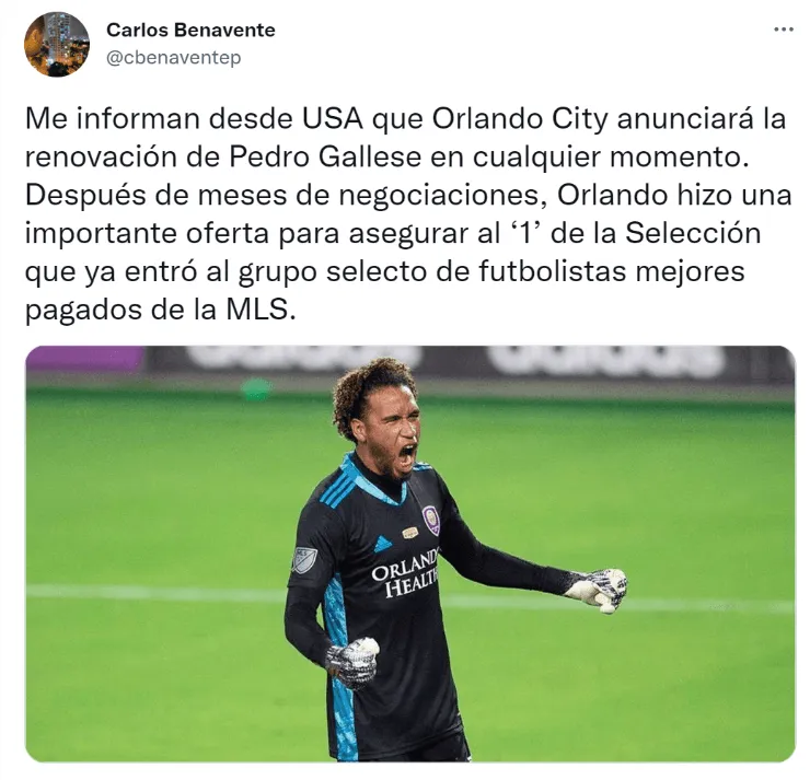 “Me informan desde USA que Orlando City anunciará la renovación de Pedro Gallese en cualquier momento. Después de meses de negociaciones, Orlando hizo una importante oferta para asegurar al ‘1’ de la Selección que ya entró al grupo selecto de futbolistas mejores pagados de la MLS”, señaló.