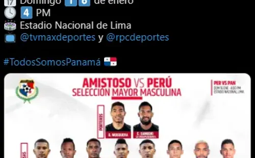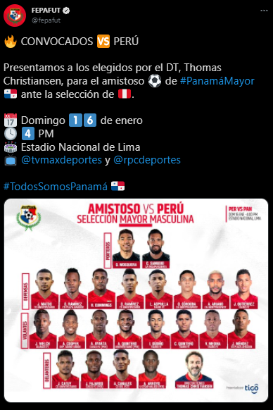 Las redes sociales oficiales de la ‘FEPAFUT’ como se hace llamar el combinado panameño, propuso lo siguiente: “Presentamos a los elegidos por el DT, Thomas Christiansen, para el amistoso de #PanamáMayor ante la selección de Perú. #TodosSomosPanamá”.