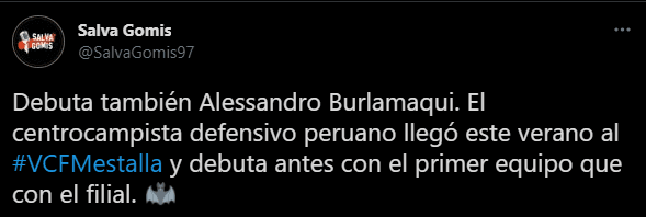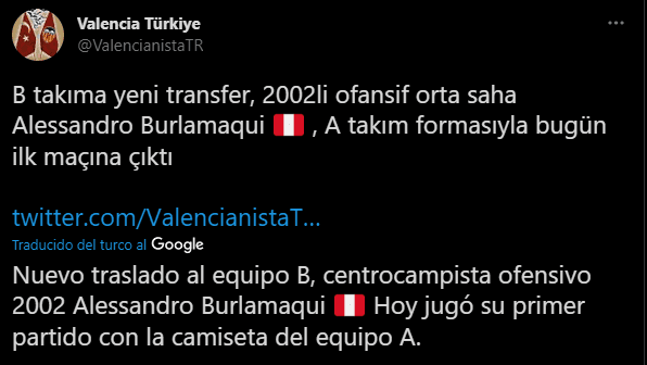 Salva Gomis (periodista español), también le dejó un recado interesante: “El centrocampista defensivo peruano llegó este verano al #VCFMestalla y debuta antes con el primero equipo que la con la filial”. Punto en favor de Burlamaqui, quien viene haciendo una parte de la pretemporada con el primer equipo.