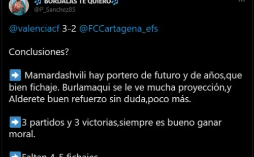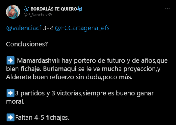 En otras palabras, Alessandro Burlamaqui fue aprobado por algunos otros usuarios que le dieron seguimiento al partido entre Valencia CF y el FC Cartagena, donde terminó ganando por 3-2 el cuadro del volante peruano. Esperemos que nuestro compatriota siga teniendo esa consideración.