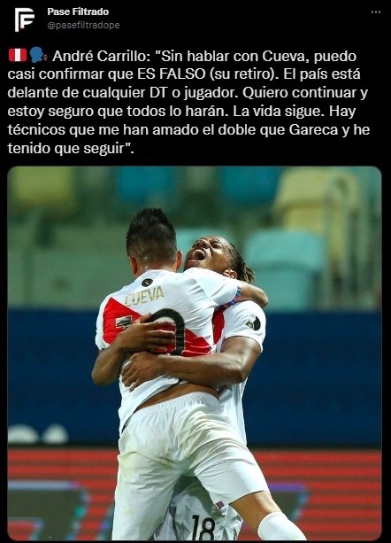 Esto fue lo que reflexionó ‘La Culebra’, luego de plantearle el tema de la renuncia de Christian Cueva a la Selección Peruana: “Sin hablar con Cueva, puedo casi confirmar que ES FALSO (su retiro). El país está delante de cualquier DT o jugador. Quiero continuar y estoy seguro de que todos lo harán. La vida sigue. Hay técnicos que me han amado el doble que Gareca y he tenido que seguir”.