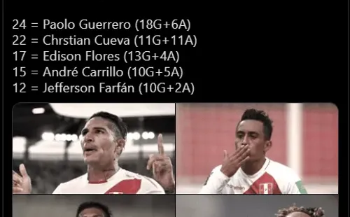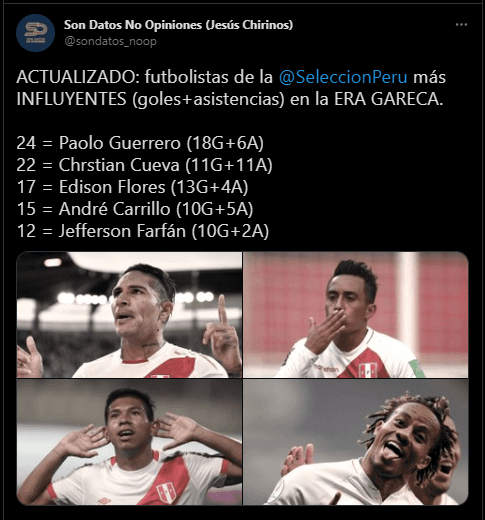 Los amigos de ‘SON DATOS NO OPINIONES’ hacen una reseña de los mejores jugadores de la Selección Peruana en la era Ricardo Gareca. Sumando asistencia y goles. Donde aparecen nombres de la talla de Paolo Guerrero y Edison Flores.