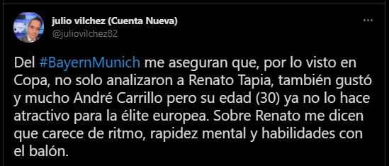 El periodista de DIRECTV Sports, Julio Vílchez, dio más luces al respecto, contando una información que podría romper algunas ilusiones: “Del Bayern Múnich me aseguran que, por lo visto en Copa, no solo analizaron a Renato Tapia, también gustó y mucho André Carrillo, pero su edad (30) ya no lo hace atractivo para la élite europea. Sobre Renato me dicen que carece de ritmo, rapidez mental y habilidades con el balón”.