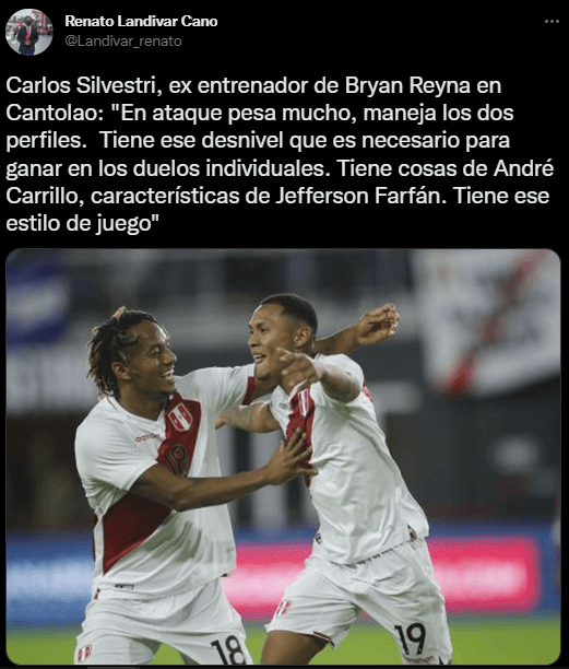 El profesor Carlos Silvestri fue claro, y lo comparó al veloz delantero con dos cracks de nuestro balompié. Hay que tomar en cuenta con quienes se les referencia a Bryan Reyna: “En ataque pesa mucho, maneja los dos perfiles. Tiene ese desnivel que es necesario para ganar en los duelos individuales. Tiene cosas de André Carrillo, características de Jefferson Farfán. Tiene ese estilo de juego”.
