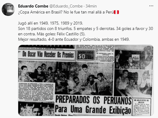 Pero cuando la Copa América se jugó en Brasil las estadísticas han sido amigables con nuestra Selección Peruana. El estadístico y periodista deportivo Eduardo Combe así lo precisa en su cuenta principal de Twitter, donde deja detalles muy interesantes para analizar, y posiblemente soñar.