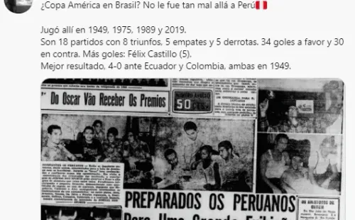 Cuando Perú fue a competir a Brasil por una Copa América, así le fue: “Jugó allí en 1949, 1975, 1989 y 2019. Son 18 partidos con 8 triunfos, 5 empates y 5 derrotas. 34 goles a favor y 30 en contra. Más goles: Félix Castillo (5). Mejor resultado, 4-0 ante Ecuador y Colombia, ambas en 1949”.