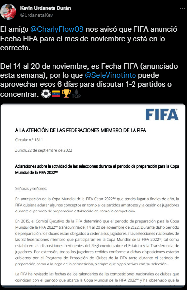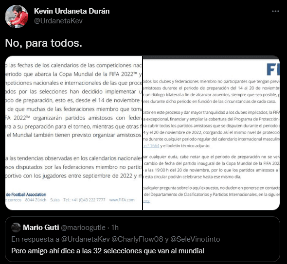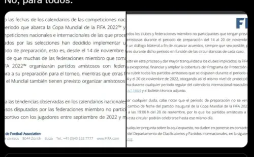 Y un motivo más, para entender el asidero de todo lo explicado, es que hay otra fuente más de información. En este caso de Venezuela, quienes alertaron a todos. Kevin Urdaneta Durán, comunicador social de ese país, adjuntó recortes del comunicado emitido por FIFA en nuestro idioma. Algunos destacaron que no les correspondía a los países que no estaban dentro del Mundial. Pero él mostró pruebas claras, las cuales compartimos acá. Hay fecha FIFA para noviembre, si no existe nada raro.