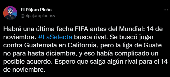 En este caso, nos vamos directamente con el tema que lo avisaron allá en ‘El Salvador’, un popular usuario de Twitter, amante del deporte rey, nos despertó la curiosidad con el siguiente mensaje: “Habrá una última fecha FIFA antes del Mundial: 14 de noviembre. La Selecta (como le dicen a la Selección de su país), busca rival”. Eso como aviso al mensaje que aparecería después.