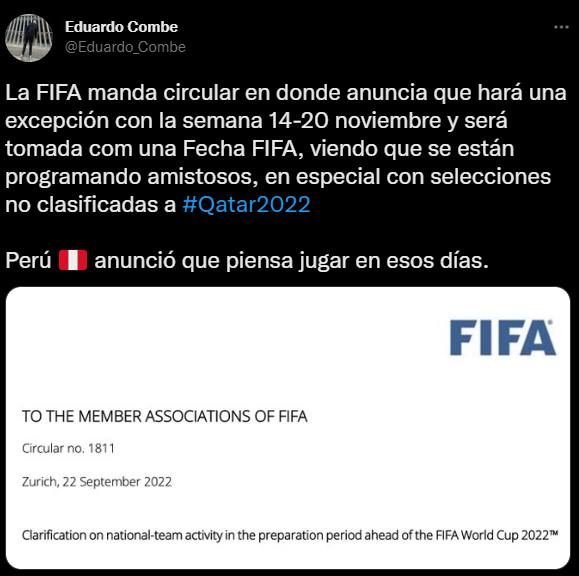 Hallamos una noticia presentada por el periodista deportivo peruano de América TV, Eduardo Combe, del pasado 23 de septiembre, donde advierte: “La FIFA manda circular en donde anuncia que hará una excepción con la semana 14-20 noviembre y será tomada como una Fecha FIFA, viendo que se están programando amistosos, en especial con selecciones no clasificadas a Qatar 2022. Perú anunció que piensa jugar en esos días”.