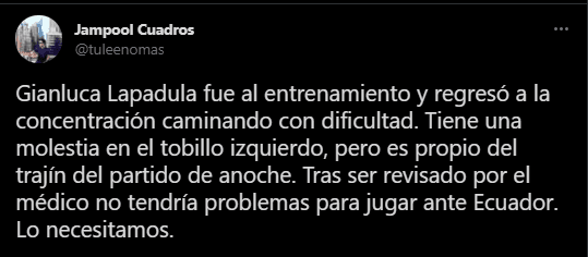 “Gianluca Lapadula fue al entrenamiento y regresó a la concentración caminando con dificultad. Tiene una molestia en el tobillo izquierdo, pero es propio del trajín del partido de anoche. Tras ser revisado por el médico no tendría problemas para jugar ante Ecuador. Lo necesitamos”.